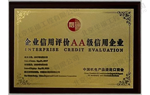 AA-level credit enterprise by the Chamber of Commerce for Import and Export of Mechanical and Electrical Products